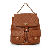 The Chanel Small Duma Backpack features quilted lambskin leather with dual CC turn-lock closure front pockets and adjustable chain shoulder straps. Gold-tone hardware and Chanel’s signature lamppost eyelets elevate the design. Compact yet functional, it offers front pocket storage, a drawstring-adjusted bucket top, and a streamlined silhouette—all delivered in luxurious Chanel craftsmanship.