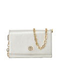 The Tory Burch Robinson Metallic Chain Wallet is a stylish and functional accessory designed to add a touch of sophistication to your ensemble. It boasts the trademark Robinson textured leather and a metallic finish, giving it a rich and eye-catching design.
